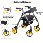 Rooly Yaşlı Yürüteç Rolatör | Oturaklı Hasta Yürüteç | 140 Kg Kapasite | 1. Sınıf Ultra Lüx | Katlanabilir